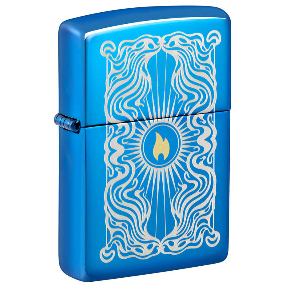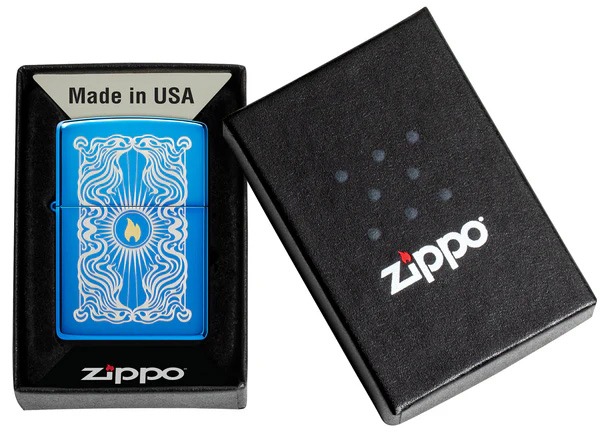 Surrounded by wafting vapor, a brass-toned Zippo flame icon appears in the center of this classic High Polish Blue lighter in a mesmerizing Laser Two-Tone design. Comes packaged in a gift box. For optimal performance fill with Zippo lighter fuel.