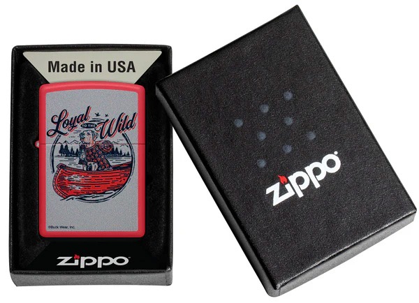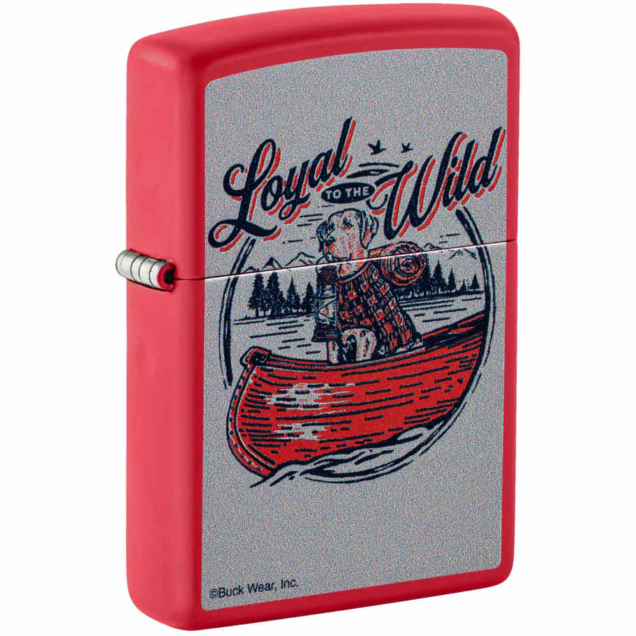 • Escape to nature with this Red Matte lighter featuring Buck Wear™, an apparel brand that combines pride, patriotism and a love of the outdoors in each of their products. The Color Image design depicts a loyal hound at the bow of a canoe along with the inscription, “Loyal to the Wild.” Comes packaged in a gift box. For optimal performance fill with Zippo lighter fuel.